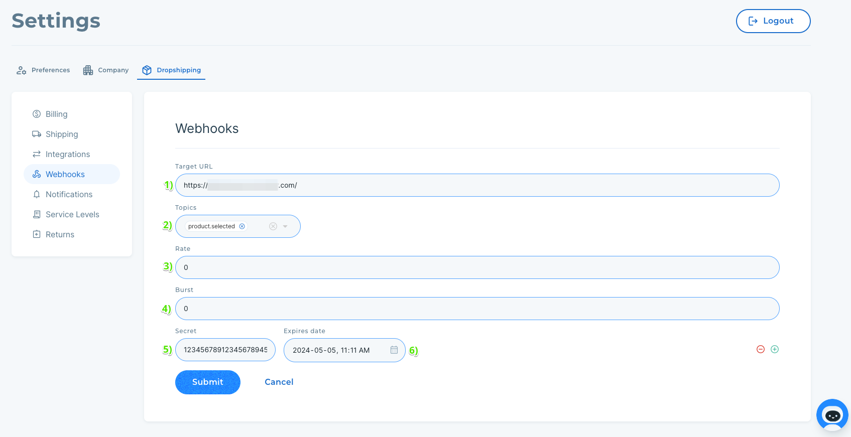 When you're ready, click "Submit" to create your webhook configuration!