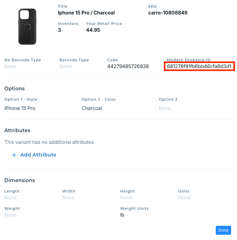 In this section, we will find the variant id for referencing the variant on Modern Dropship. We are assuming you have some unique method for referencing variant (a must) and a way to reference the product (optional). This could be a barcode, SKU, primary key within a database, etc.