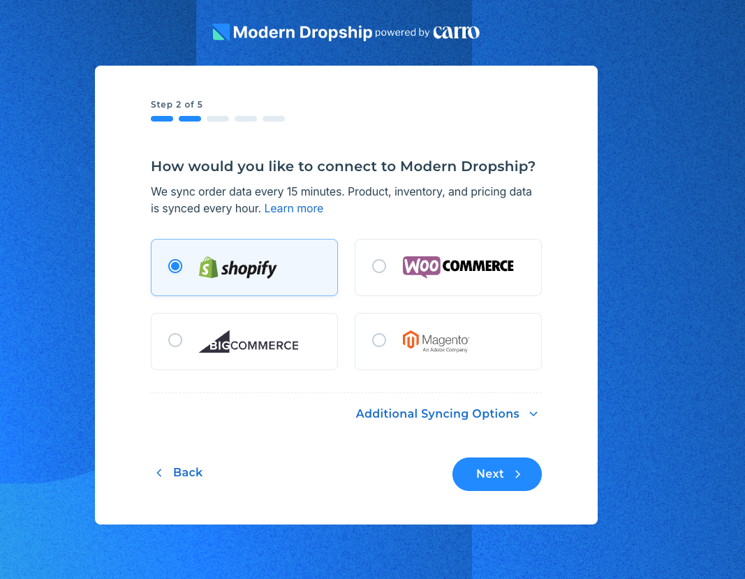 Click "Install the Modern Dropship App on Shopify" button, which will open up the Shopify store selector and all available stores used by the email you are creating the account with.