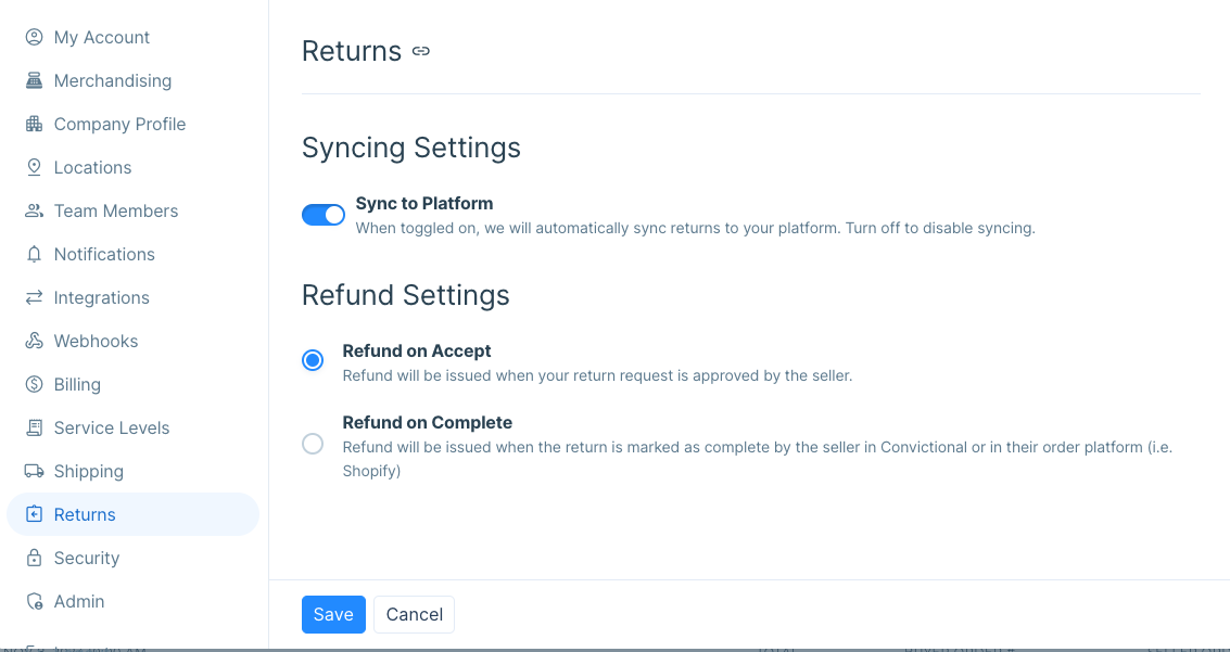 Refund setting - This setting will control when your customer gets a refund for the funds transacted through your ecommerce checkout. You can choose to either refund the order total to your customer when the return is accepted or completed by your partner.