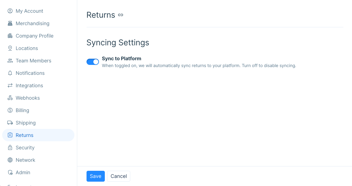 If you are integrated with Shopify, you will have the option set to sync returns to your platform turned on by default. This means that refunds requested by your partner will sync through to your Shopify Admin, and you can mark them as complete from there. This setting is available in the Returns section of the Settings.