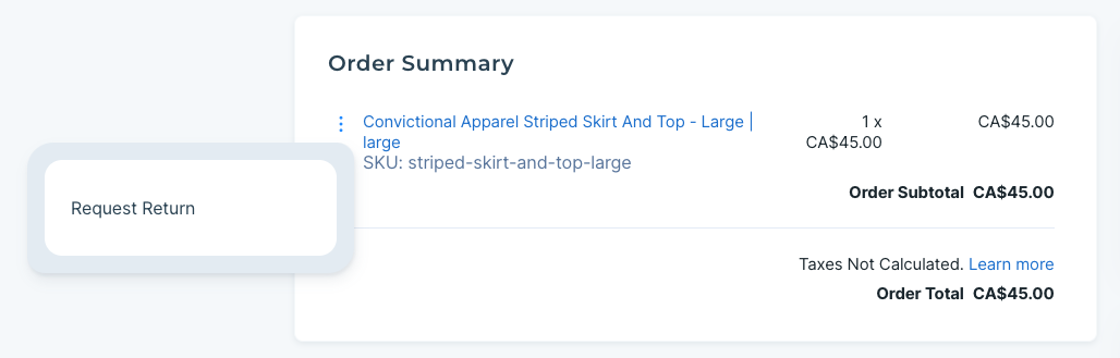The "Request Return" button displays after clicking the three dots beside the order line item.