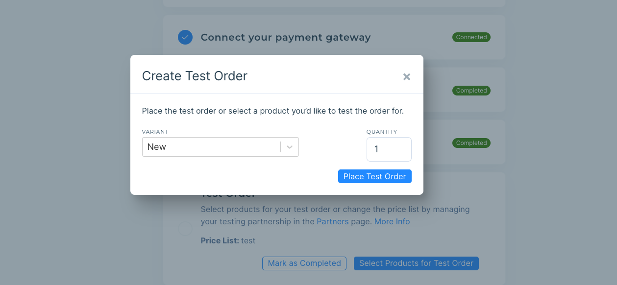 Select the SKU and quantity you would like to test, and you can hit the 'Place Test Order' button: