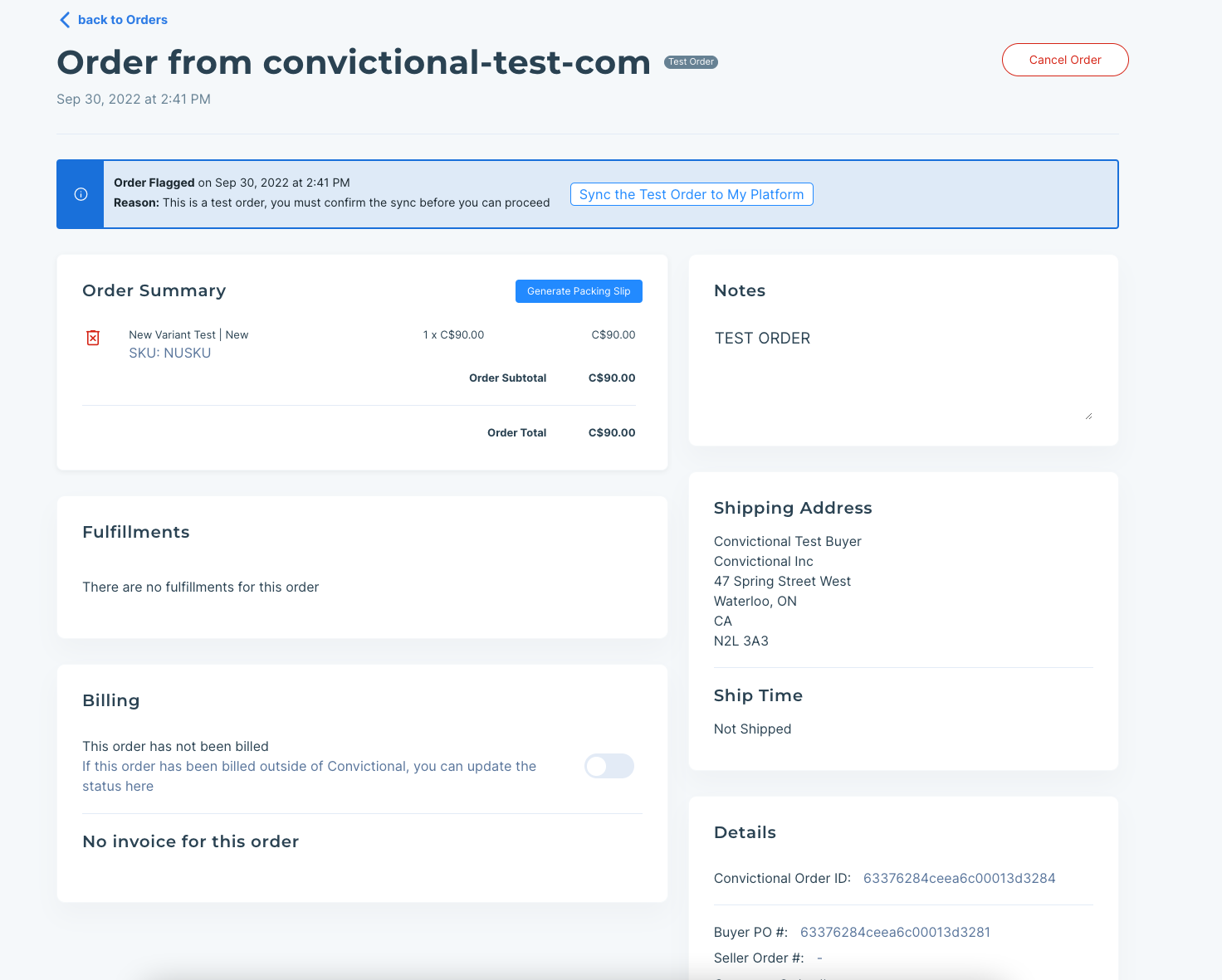 To test order syncing to your platform, go ahead and use the Sync button at the top of the page. This order will be synced in the next order sync (usually within 15 minutes). In order to sync the fulfillment status from your ecommerce platform, you will need to mark the order as Fulfilled (Completed on some platforms) and ensure that the fulfillment details include a Carrier Name and Tracking Number. This is required to sync the order status back to Modern Dropship. More information on this process can be found in this guide.