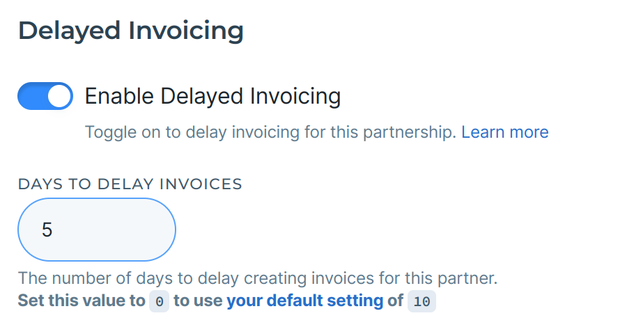 Important: "Enable Delayed Invoices" must be on if you'd like to apply these settings. If it is turned off, then this partner will use whatever your company's default billing settings are. View the Default Settings section just above to see how you can select your default settings: