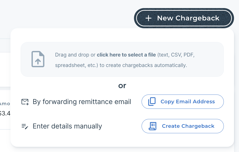 Upload a CSV, XLSX, or PDF file of outstanding chargebacks. Modern Dropship will ingest the chargeback data and create individualized chargebacks from your file.