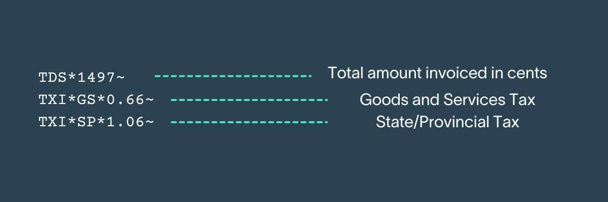 The TXI segments are the tax items. Each type of tax has an associated code — GS represents Goods and Services Tax and SP represents State/Provincial Tax.