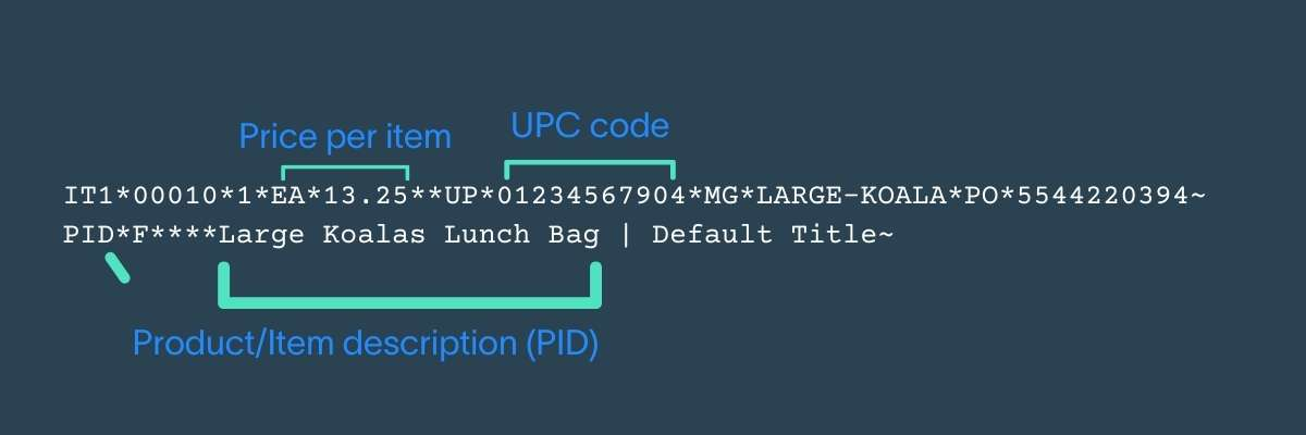 The IT1 loop represents the item being invoiced — it’s identified here by its UPC code and includes its unit price as well.