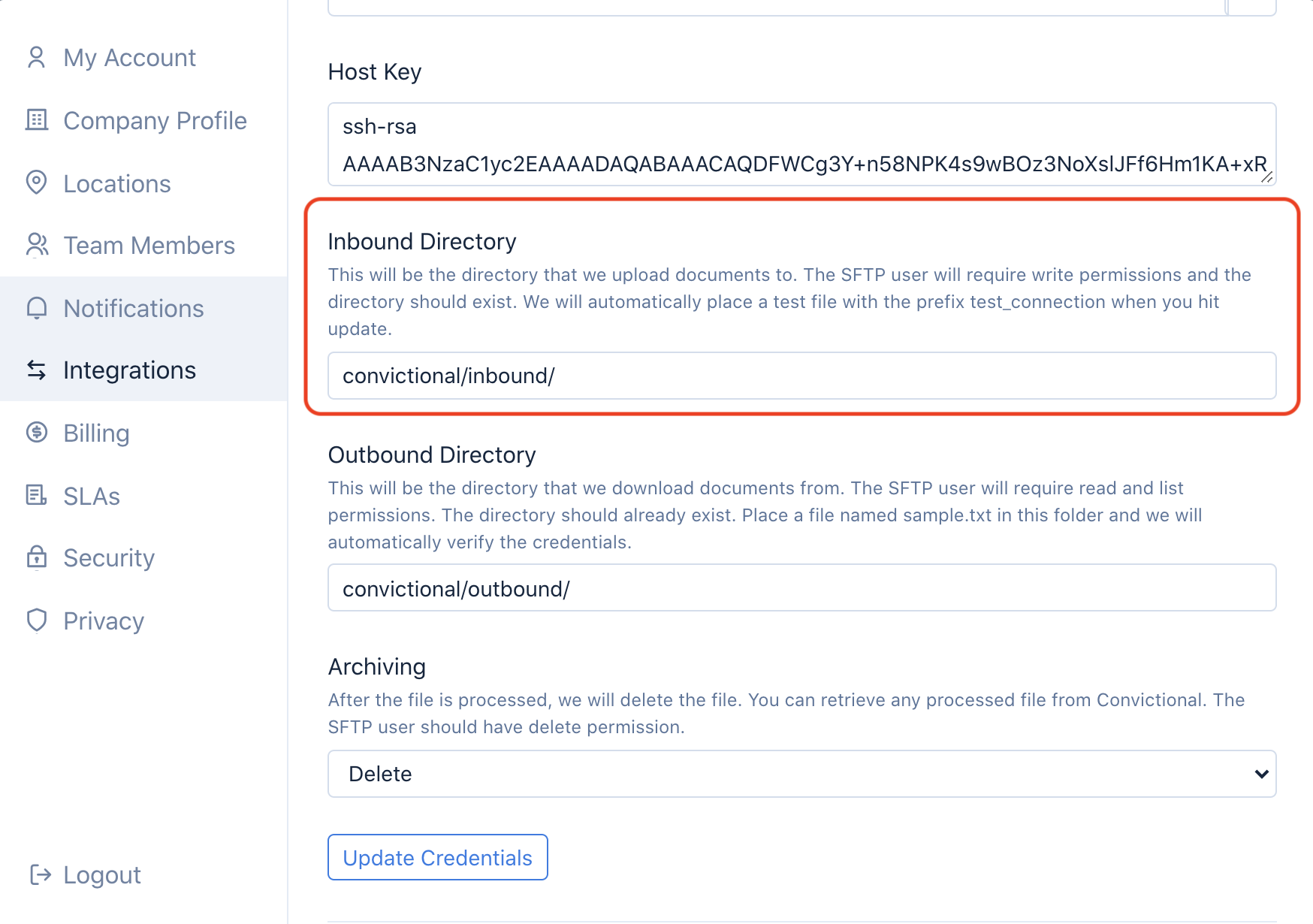 Our system requires read permission on the "Inbound Directory". This information can be found under Settings in the Integrations tab.