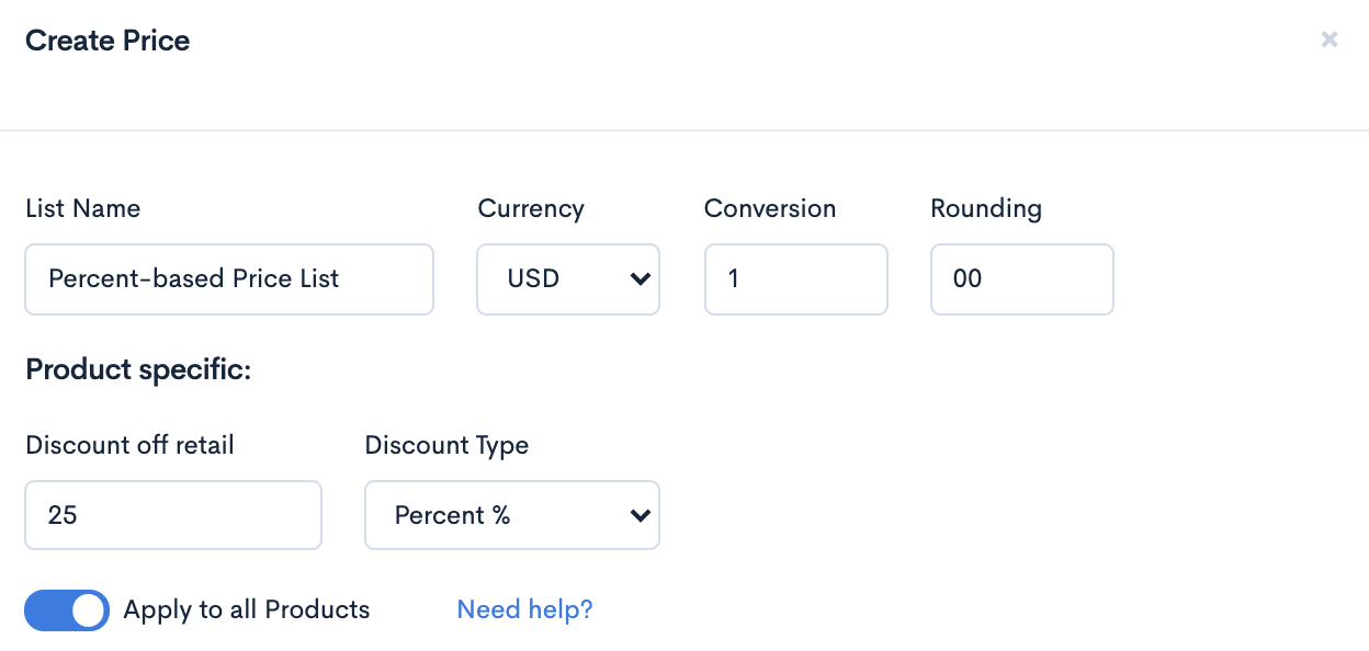 To establish percentage-based pricing, the supplier could first create a price list applying a 25% discount off retail (the retail margin) and apply it to their entire product catalog.