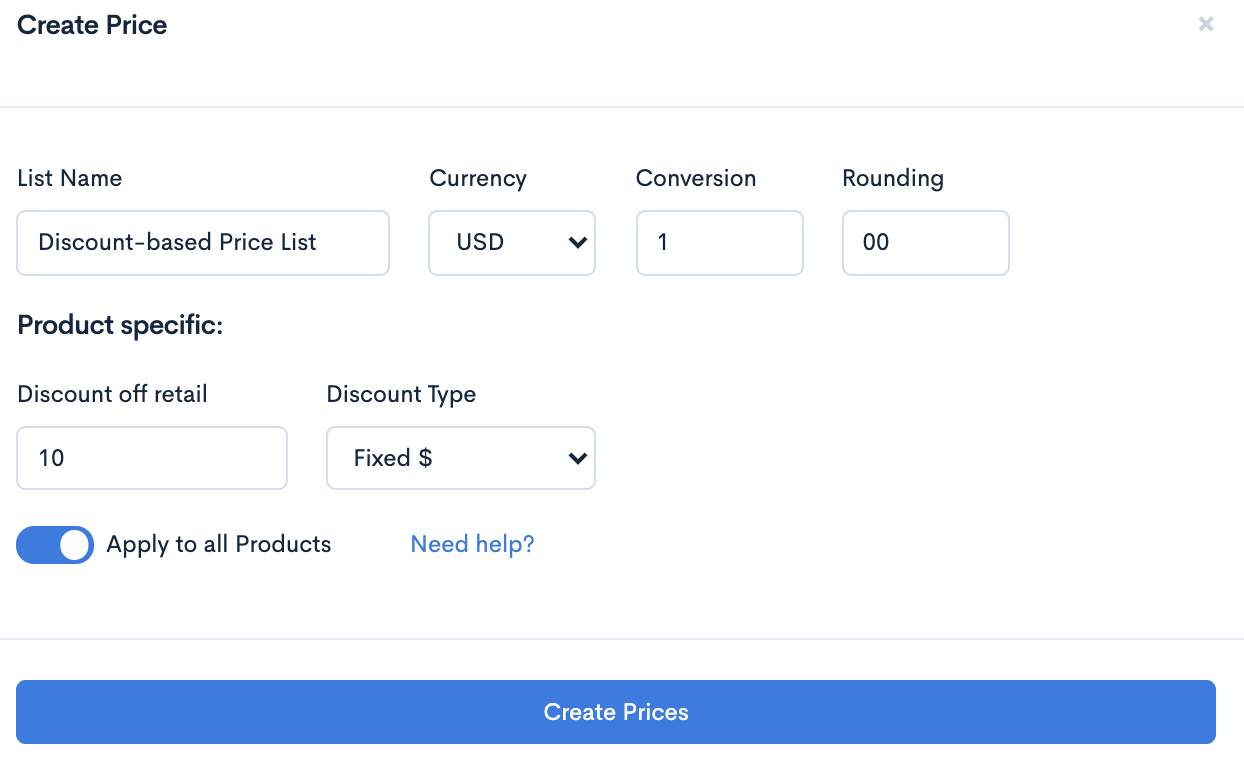 To establish fixed-rate pricing, the supplier could first create a price list applying a $10 discount off retail (the retail margin) and apply it to their entire product catalogue.