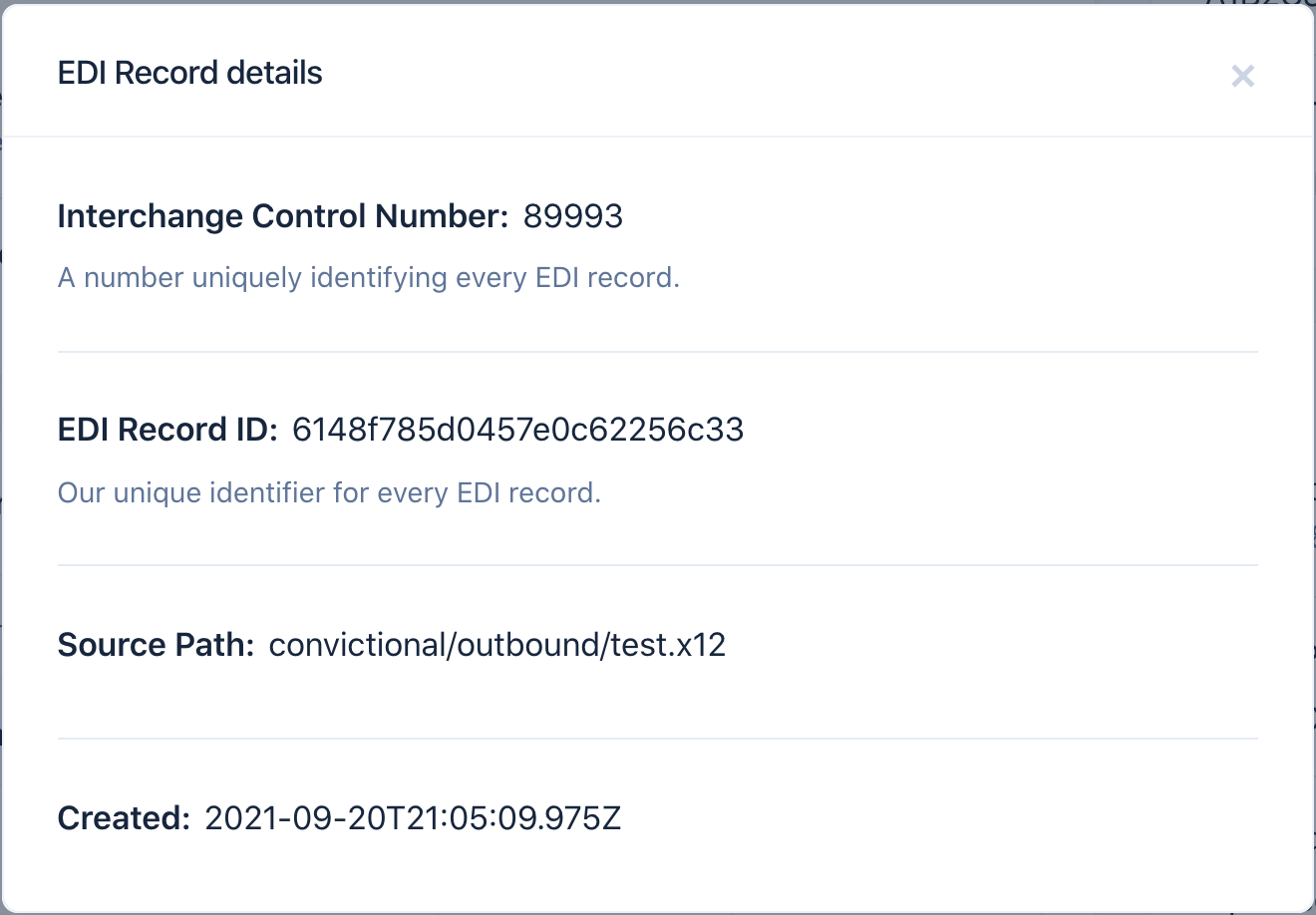 On the right side, you have three buttons. The first is the ability to download the file. Every file we receive, we immediately back up for retry, auditing, and general good practices. The second button is the retry button. If a file fails for any reason, you may want to retry it. Ex. Updating the write permissions on an SFTP server so the Purchase Order Acknowledgement (855) can be written to it. The last button is an information button. It will open up further details about the inbound file.