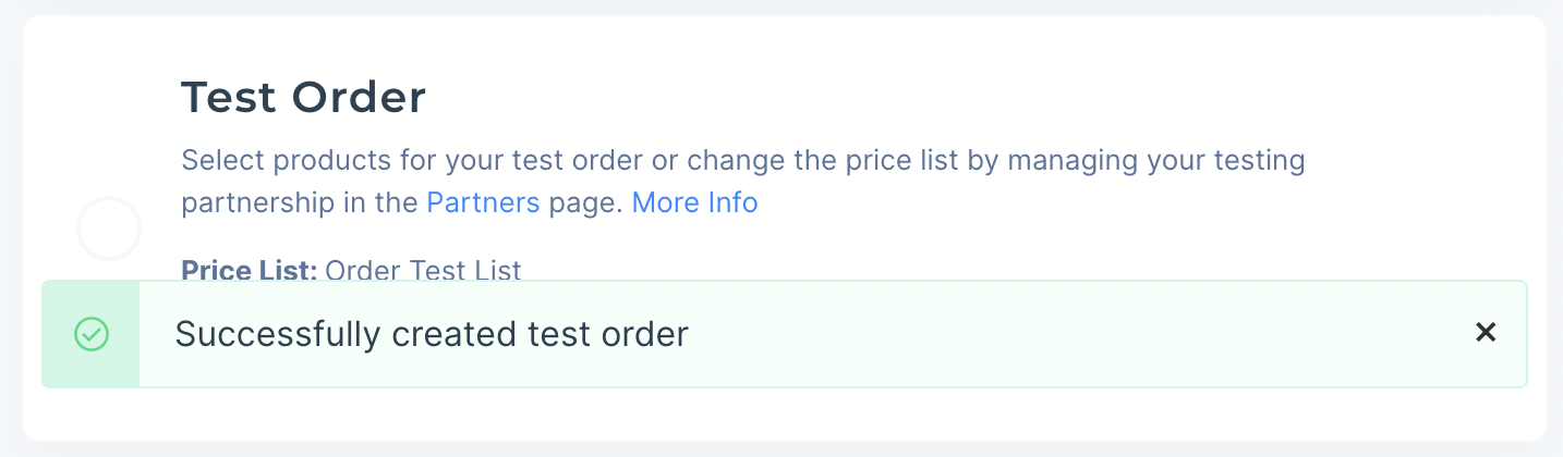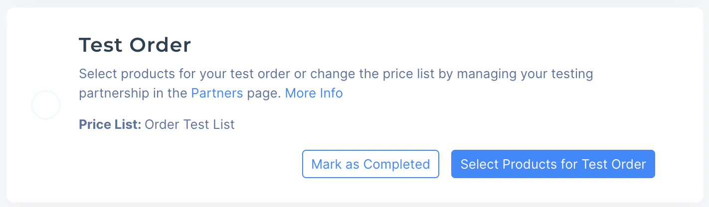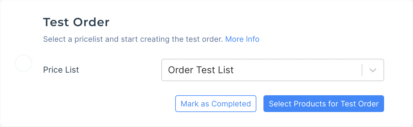 When you are ready, navigate back to the onboarding card and click on 'Mark as Completed' to complete this onboarding step or click on 'Select Products for Test Order' to create another test order to verify your process: