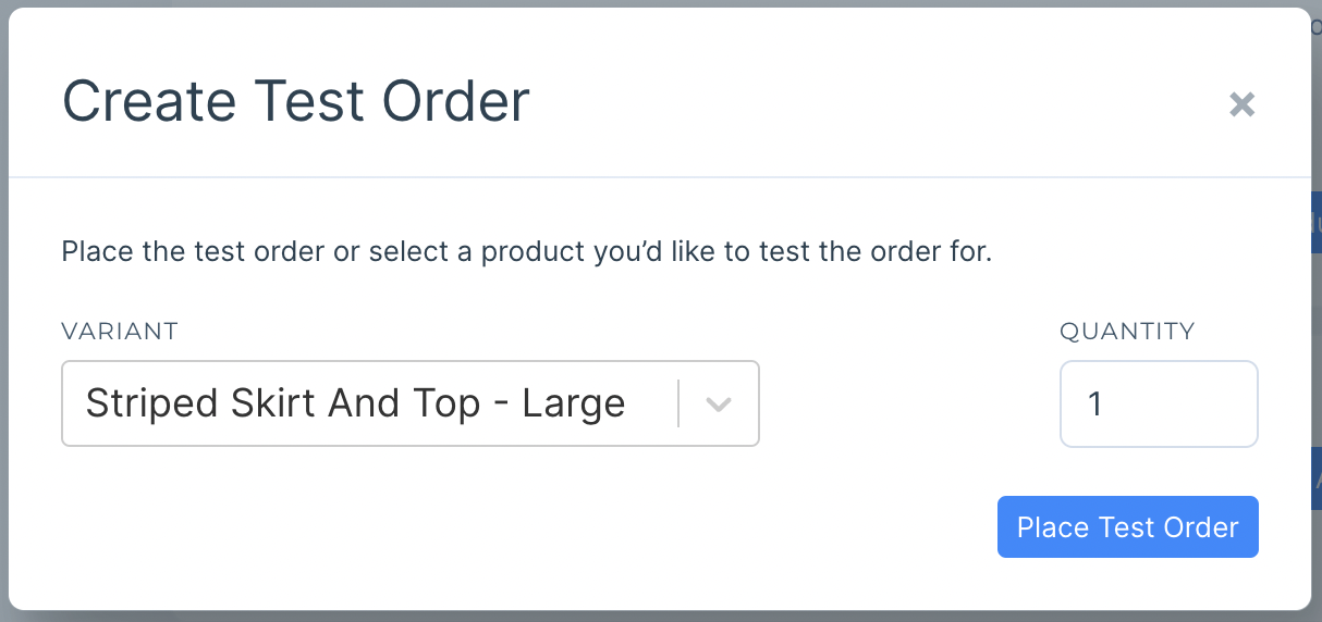 A modal will appear for you to create an order based on a variant and desired quantity. Click on 'Place Test Order' to create a test order: