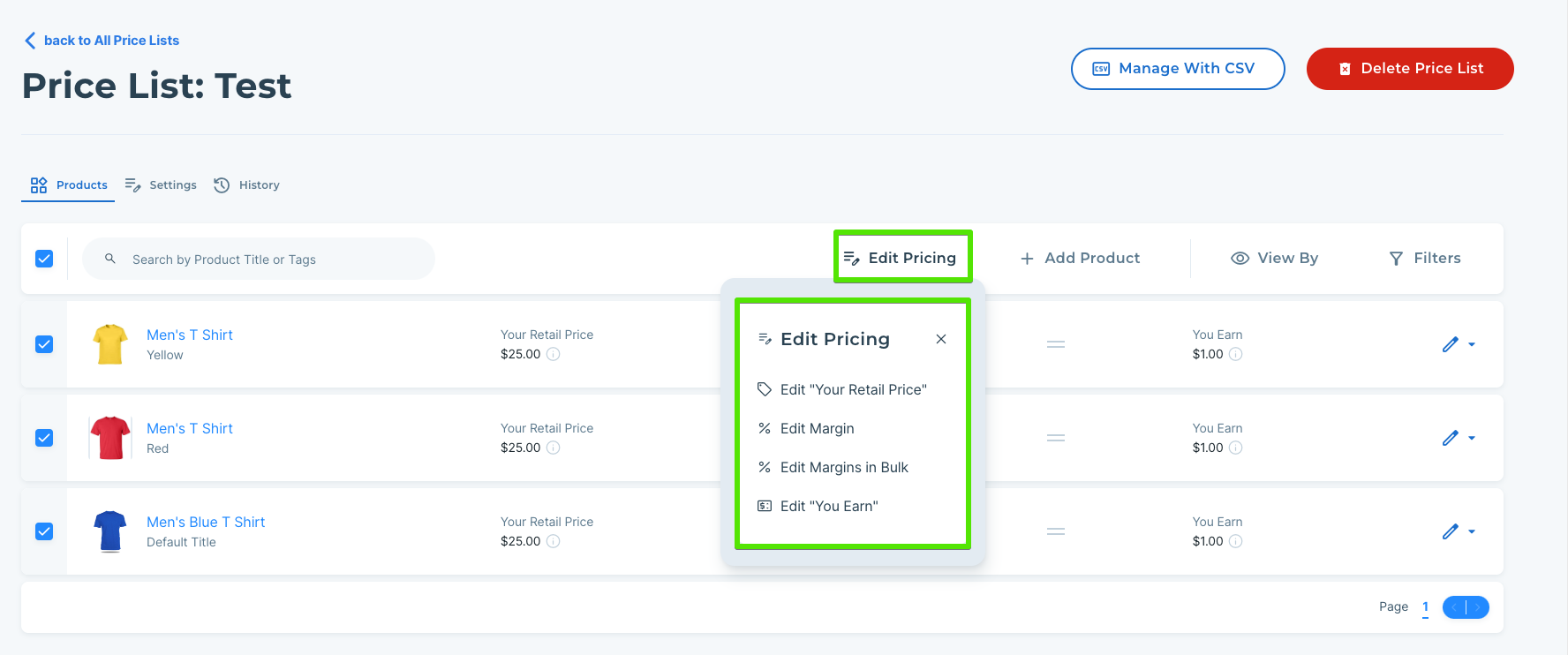 Once those options are select you can choose to 'Edit Pricing' showing beside the 'Add Product' button. From there you will have the options to update the Retail and You Earn price for the selected products, or update the margins in bulk: