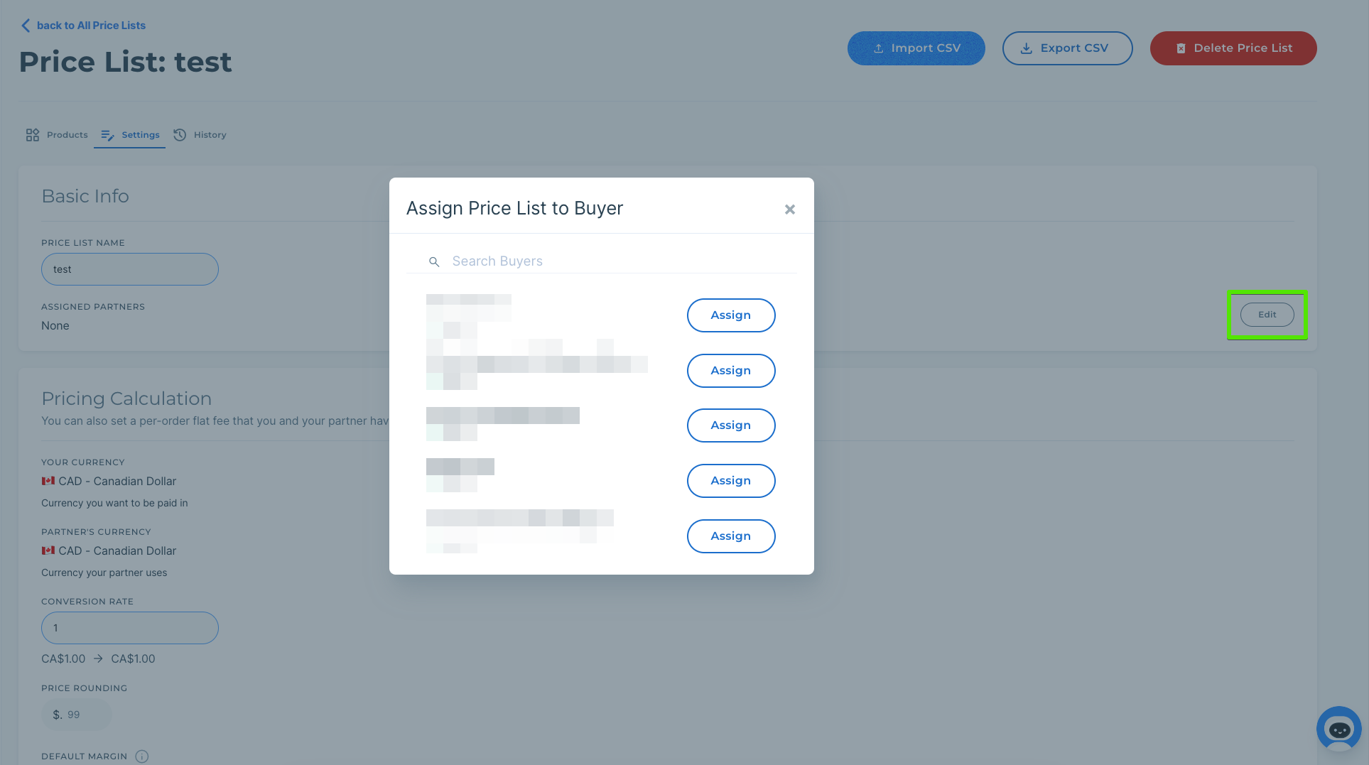 This feature is what allows you to assign a specific price list to a retailer (AKA retailer). Having your price list assigned to a retailer is mandatory. If this is missing, your partner will not be able to sell your products on their platform. You are able to assign multiple retailers to one price list. This can be modified at any time to include as many or as few retailers as you wish. To modify, click the edit button, and you will be able to select all available retailer partners: