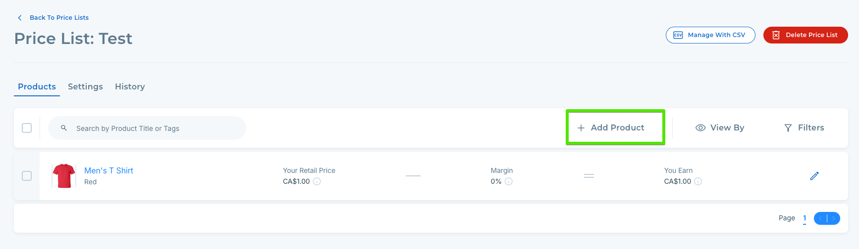 Newly created products synced to Modern Dropship will NOT be added to this price list for dropshipping. This indicates that any products you wish to sell will be manually added to the price list. In order to add new products, you'll need to select 'Add Product' and select the new products by searching for their product title, as shown below: