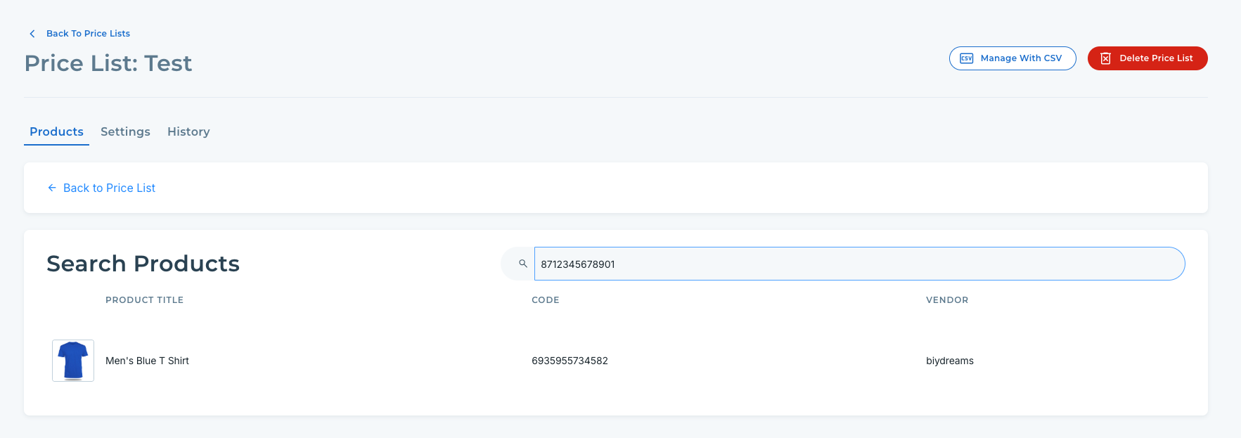 Navigate to your price list and find the product you'd like to change the pricing scheme on. You can use the search bar for this if you have too many products to navigate through one by one.
