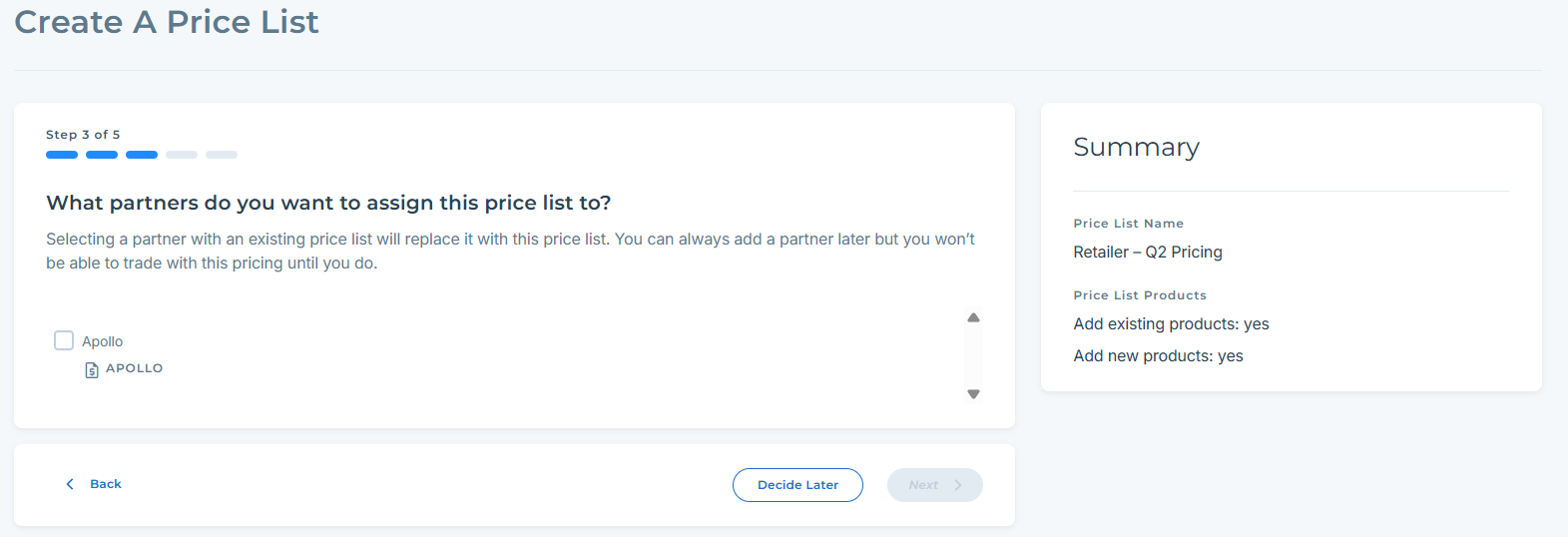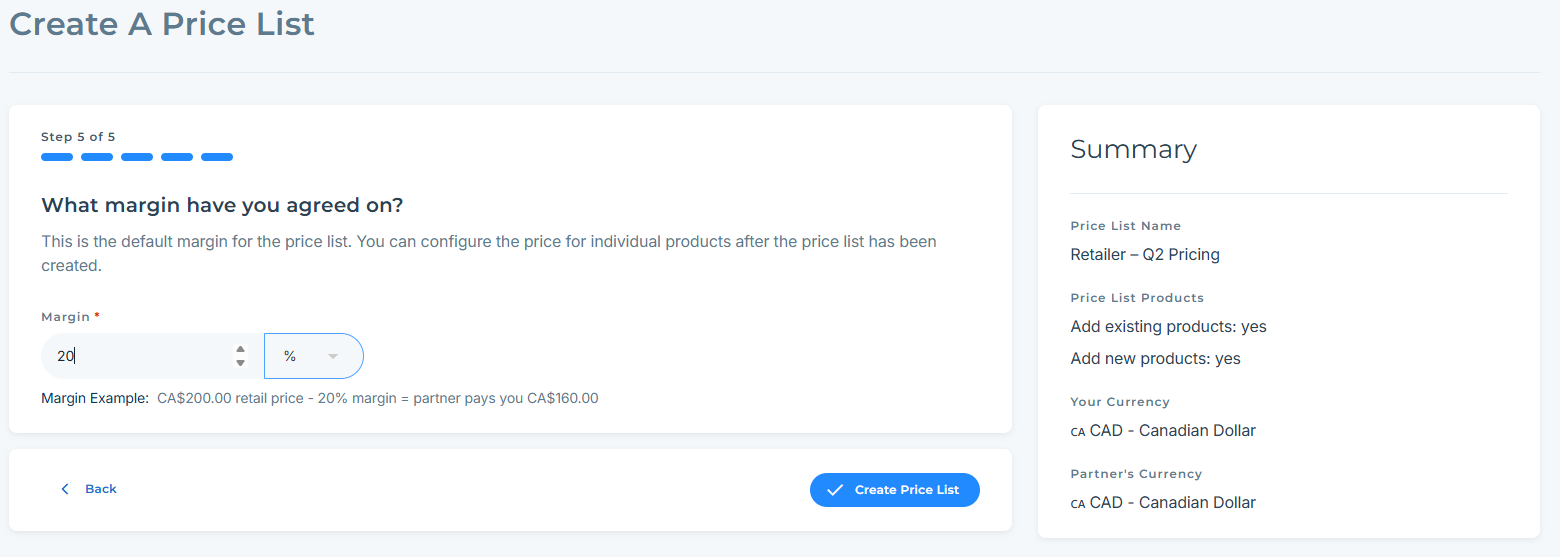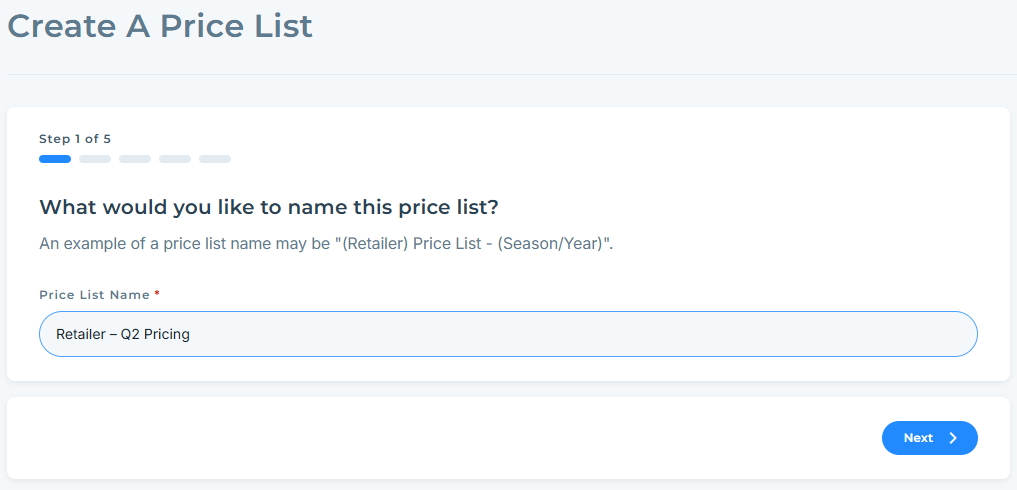 Enter a name for the Price List (for example: Retailer – Q2 Pricing).